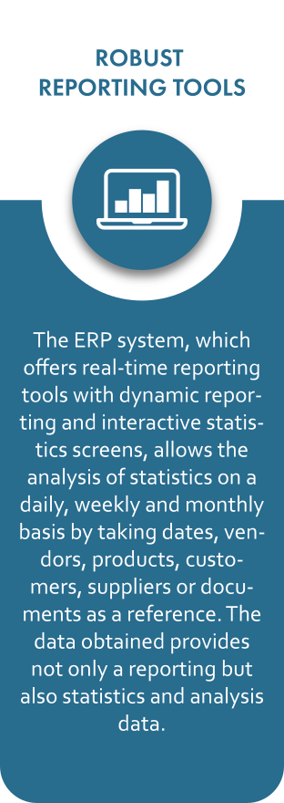 AKEAD ERP system which updates and develops itself continuously to offer a complete system to the organizations, works with business partners to provide the best solution. Enterprise Resource Planning, with a suitable structure for any kind of business from different industries, serves for the companies to save time and cost in accordance with the shared objective, have a more productive workforce, obtain an effective resource management and gain competitive edge. ERP software, which shows how to achieve a reliable planning with company objectives, offers solution with an integrated system and enables responding to different needs.